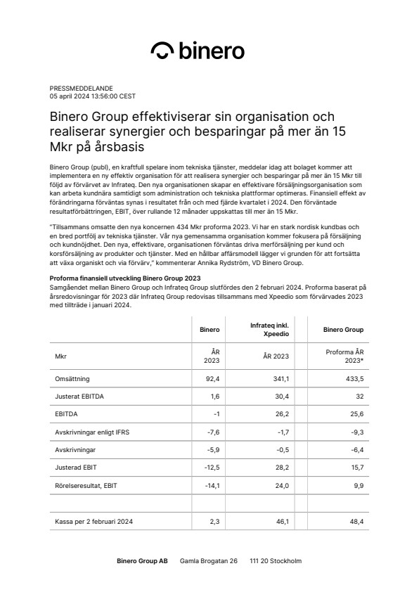 3. Binero Group effektiviserar sin organisation och realiserar synergier och besparingar på mer än 15 Mkr på årsbasis