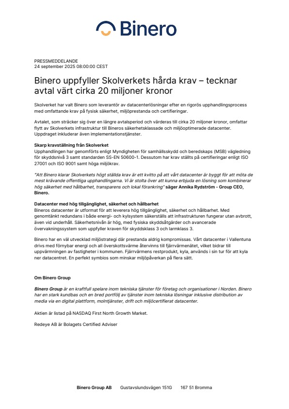 ”Att Binero klarar Skolverkets högt ställda krav är ett kvitto på att vårt datacenter är byggt för att möta de mest krävande offentliga upphandlingarna. Vi är stolta över att kunna erbjuda en lösning som kombinerar hög säkerhet med hållbarhet, transparens och lokal förankring” säger Annika Rydström - Group CEO, Binero.