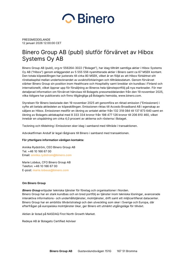 Binero Group AB (publ), org.nr 556264-3022 (”Bolaget”), har idag tillträtt samtliga aktier i Hibox Systems Oy AB (”Hibox”) genom erläggandet av 5 555 556 nyemitterade aktier i Binero samt ca 67 MSEK kontant. Den totala köpeskillingen har justerats till cirka 80 MSEK, vilket är en följd av att Hibox förbättrat sitt rörelsekapital mellan undertecknandet av avsiktsförklaringen och tillträdesdatum. Genom förvärvet stärker Binero Group sin position inom Healthcare och Hospitality samt breddar sin kundbas i Finland och internationellt, vilket öppnar upp för försäljning av Bineros hela tjänsteportfölj på nya marknader. För mer detaljerad information om förvärvet hänvisas till Bolagets pressmeddelanden från den 19 november 2025, vilka tidigare har publicerats och finns tillgängliga på Bolagets hemsida, www.binero.com.